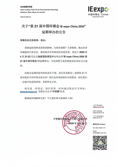 2月26日,中國環博會主辦方發布《關于“第21屆中國環博會IE expo China 2020”延期舉辦的公告》并宣布,原定于2020年4月21-23日于上海舉辦的第21屆中國環博會延期舉辦,“延期后的具體時間將另行通知”。