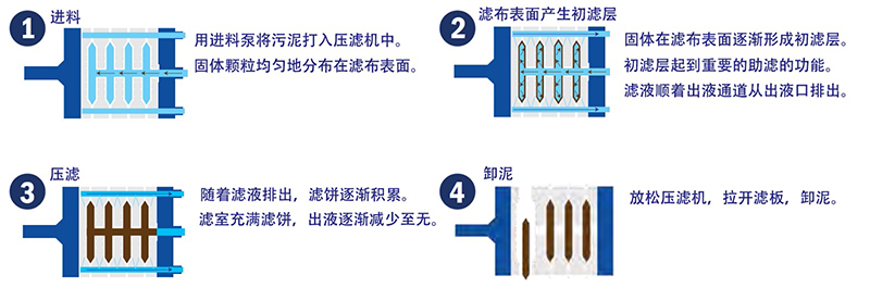 污泥通過污泥泵打入角上的進料孔流入每個濾室,固體顆粒積聚在濾布表面,濾液透過濾布流入濾板上的出液孔,濾液通過出液管流出進入下一步流程。