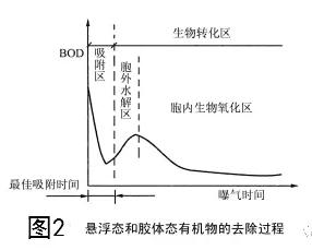 被吸附在活性污泥微生物細胞表面的有機污染物,在透膜酶的作用下,溶解態(tài)和小分子有機物直接透過細胞壁進入細胞體內(nèi),而膠體態(tài)和懸浮態(tài)的大分子有機物如淀粉、蛋白質(zhì)等則先在細胞外酶一水解酶的作用 下,被水解為溶解態(tài)小分子后再進入細胞體內(nèi),此時水解產(chǎn)生的部分溶解性簡單有機物會擴散到混合液中,造成混合液BOD值升高,如圖2中胞外水解區(qū)曲線所示。