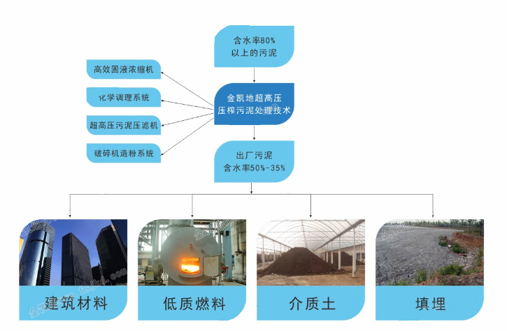 在少量添加劑的情況下,高效濃縮機(jī)可使污水處理廠含水率98%的污泥快速脫水至95%以下,含水率至95%左右的污泥經(jīng)過無害化或資源化調(diào)理后,直接送入“超高壓污臥式濾板壓榨機(jī)”,一次性脫水至含水率40%-50%,輸送機(jī)輸送至污泥貯藏區(qū)域等待進(jìn)一步綜合利用。